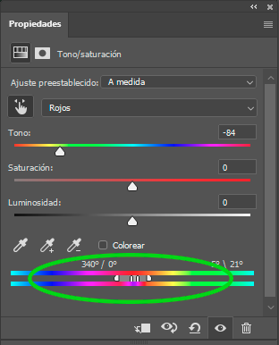 después solo tendrás que mover la barra de tono y veras como ya empieza a cambiar el color del tono seleccionado